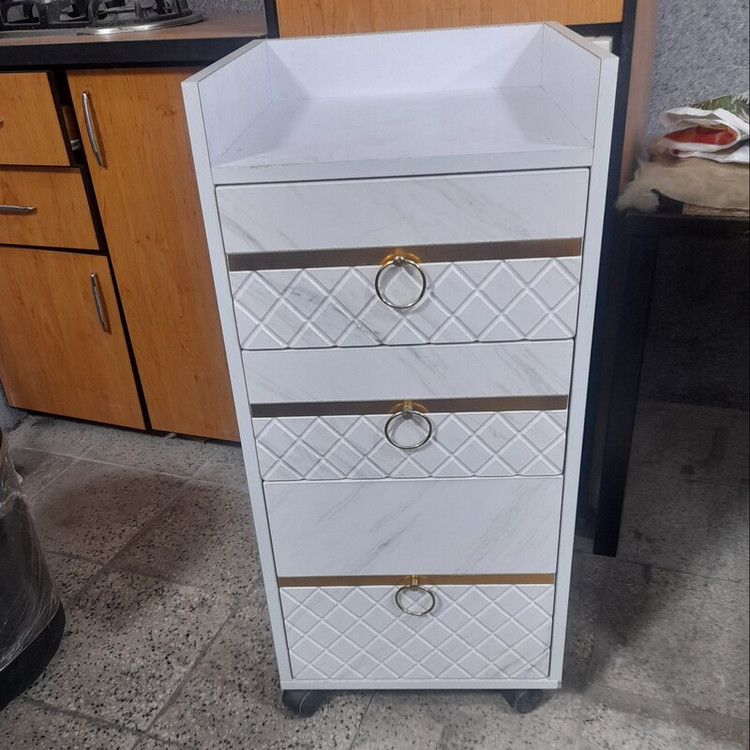 ترولی چوبی آرایشگاهی فلکسی دوکشو یه کمد سفید ورق طلایی ارسال به سراسر ایران هزینه ارسال به عهده ی خود مشتری می باشد