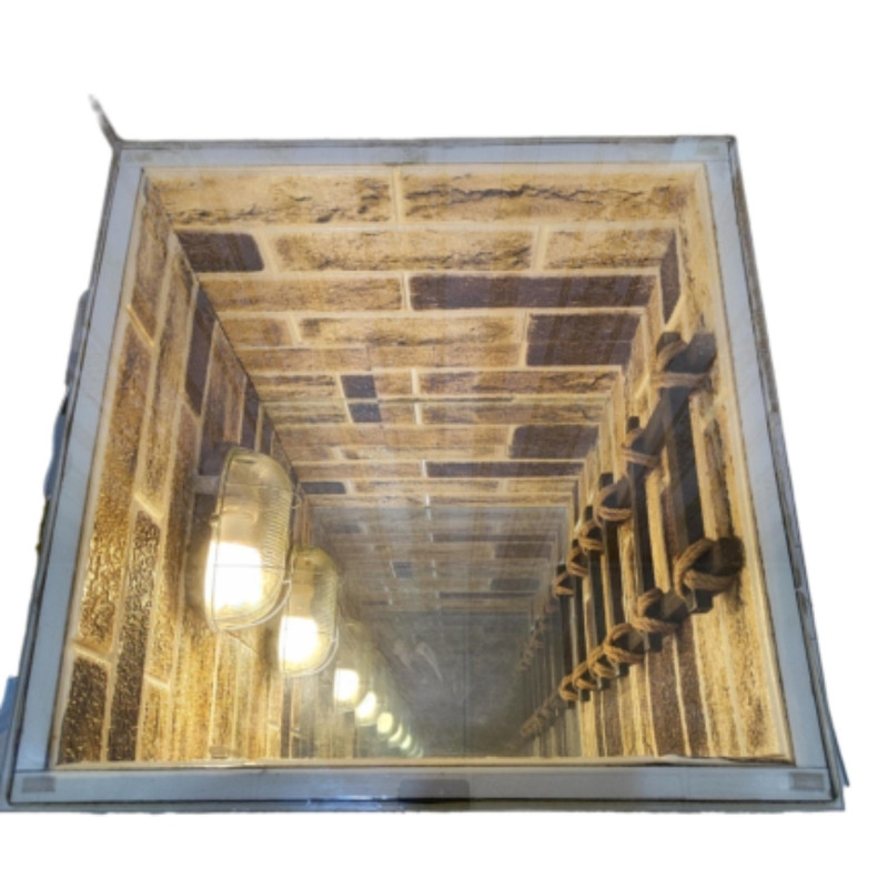 داخل میز با یک چراغ و یک نردبان تزیین شده است و تصویر داخل به طور متناوب تکرار میشود.